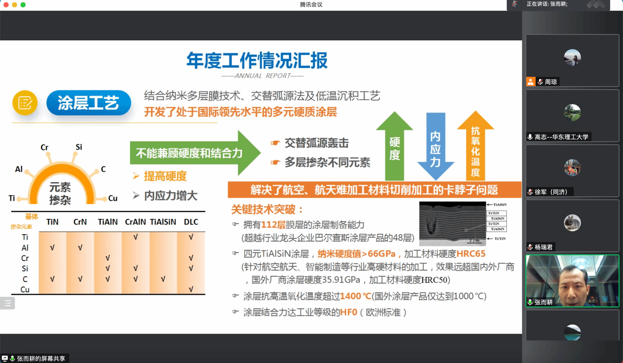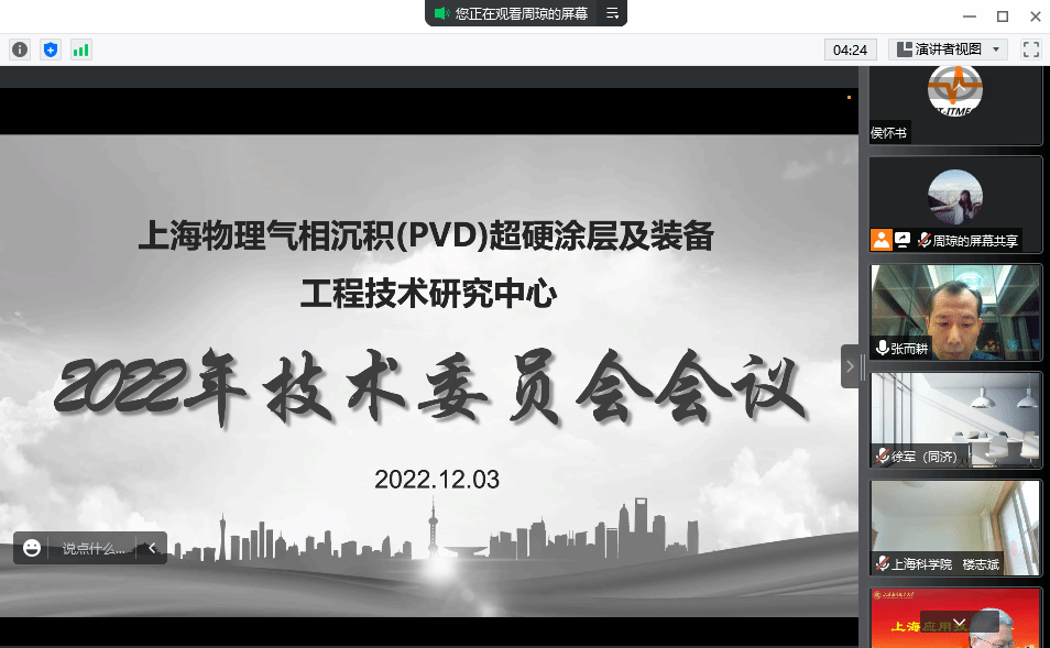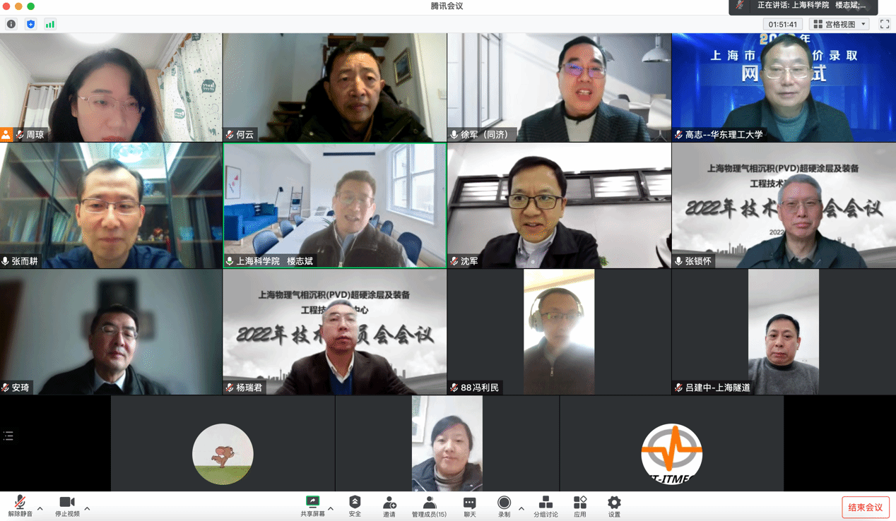 12月03日,上海物理气相沉积(PVD)超硬涂层及装备工程技术研究中心技术委员会会议通过线上会议举行。工程中心主任张锁怀教授主持并致辞。同济大学徐军教授,深圳大学沈军教授,华东理工大学安琦教授,华东理工大学何云教授,上海科学院楼志斌教授,华东理工大学高志教授,上海盾构设计试验研究中心有限公司吕建中教授,上海新弧源涂层技术有限公司冯利民总经理等技术委员会专家应邀参会。学科办副主任刘振江教授,机械工程学院杨瑞君书记,工程中心常务副主任张而耕教授,工程中心侯怀书教授等参加会议。