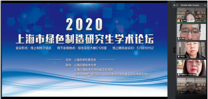 2020年12月5日,由上海市学位委员会主办,上海应用技术大学承办的2020上海市绿色制造研究生论坛顺利召开,论坛主会场设在机械工程学院,由上海市物理气相沉积(PVD)超硬涂层及装备工程技术研究中心具体组织,通过线上、线下结合的方式举行。本次学术论坛为促进本校研究生了解绿色制造领域未来的发展方向,增强对绿色制造——物理气相沉积产业的认识,同时与业界大师的交流互动,帮助优秀研究生了解相关学科前沿动态,拓展研究生视野,提升科学素质,增强科研兴趣,增加他们和国内专家交流的机会。出席本次论坛的有:受邀参加的校外知名教授10名,研究生院副院长、学位办主任翟育明,机械工程学院领导班子,张而耕教授,侯怀书教授,部分机械工程学院教师,兄弟院校研究生30名,校内研究生120余名。本次会议由周琼主持。